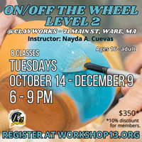 For those interested in learning how to make pottery on the wheel for the first time, or those that have very limited experience. Classes are for six weeks at my studio in Haydenville. See website to learn more and to register.