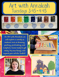 Register for 4 week blocks! *$95/block when you use code BACK2SCHOOL! Effective until October 1st* Drop by after school, doors are open 2:15-5:15pm, and work on your creative art practice among peers with the mentorship of a professional artist & educator, Chloe Torri. We will have a new, optional project each week for you to join in on if you like OR you can bring your own projects, sketchbook, or inspiration. ALL art materials are provided!